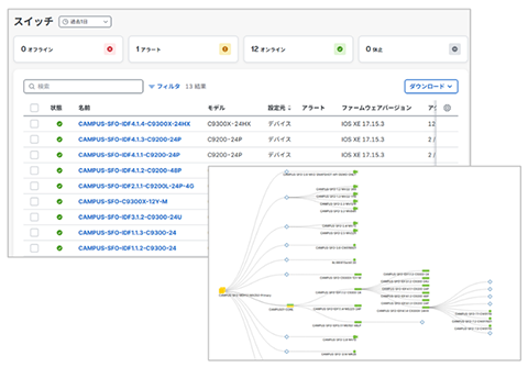 Merakiダッシュボードで管理しているデバイスを一覧で表示。トポロジーツールでネットワーク構成を自動描画
