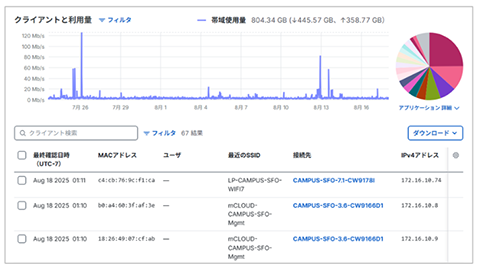 ネットワークの通信状況、アラート、イベントログだけでなく、クライアントレベル/アプリケーショントラフィックを可視化
