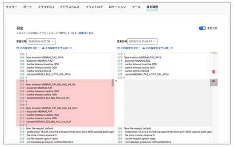 また、任意の2つの日時における設定変更点をハイライトできる機能があるため、変更履歴も簡単に把握