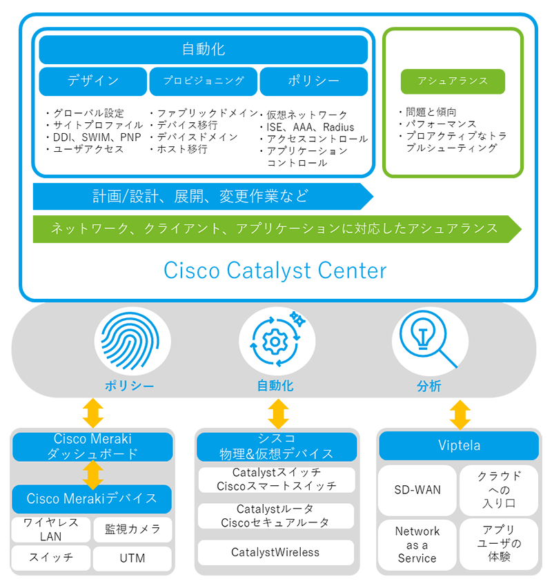 自動化- 「SD-WAN」だけでなく、「SD-Access」(Software Defined Access)で、エンド ツー エンドのネットワークに一環したポリシーを適用し、ユーザ、端末を制御。ネットワーク機器のゼロタッチ導入など、運用管理に関する作業を自動化して俊敏性と確実性を高めます。